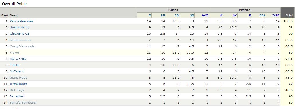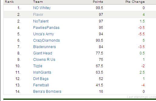 (Me and tizzle share the daily gas mask as we drop 3.5 pts each and….OMG!…rarer than a double rainbow, Berra’s Bombers gain the most daily pts of any team with a 2 pt jump in the standings. He’s at 19 pts and about to start picking off teams faster than Arazi picked off horses in the Breeder’s Cup Juvenile low those many years ago)…..