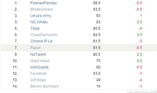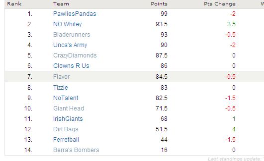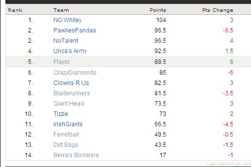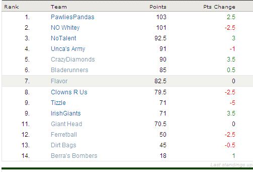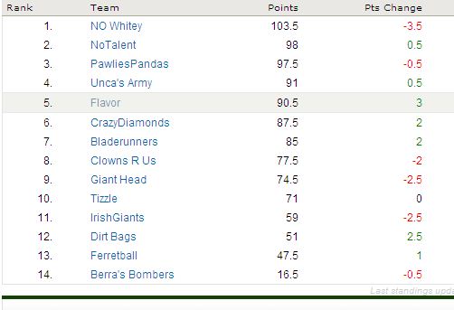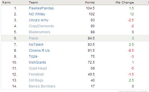 And while I’m not posting the Flap Standings do to some technical shortcomings, it should be noted that Berra’s Bombers reeled off a 2.5 pt EXPLOSION bringing his team total to 17. This could get REEEEEAL interesting if he keeps that up 🙂