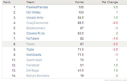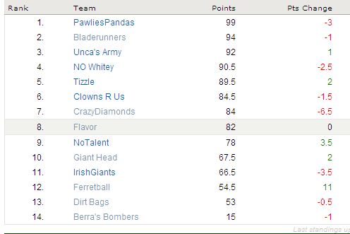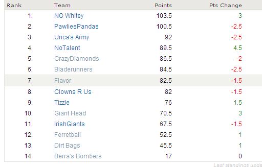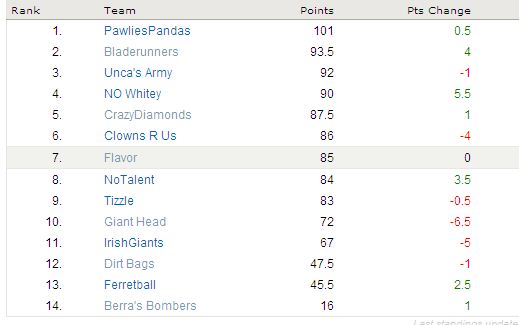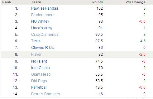 (Yours truly takes a 6 point leap, Pawlie is free falling and the bottom of the league is seeing nothin’ but red)