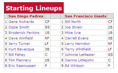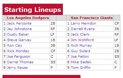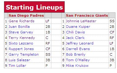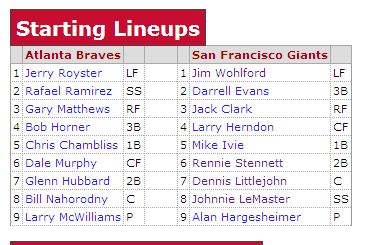 I’m skipping the rest of 1981. The strike year was dumb and isn’t worth our time. It’s opening day, April 13th, 1982. Alan Fowlkes is pitching for us against John Montefusco. That doesn’t seem right, does it? We traded the Count for Doyle Alexander, actually a decent trade if you just look at the single year Alexander pitched for us: 11-7, 2.89 ERA in the strike year. We turned around and flipped him to the Yankees for Andy McGaffigan. Whoops. He was not very good for us. Was it just me, or did the Giants make some spectacularly horrible trades in the early 80’s? Anyway, it was Fowlkes vs The Count today. We won 3-2. Minton relieved Fowlkes and went 3 innings for the save. Those were the days when a save was an earned save. I gotta admit, I like the first 6 spots of our line up……..