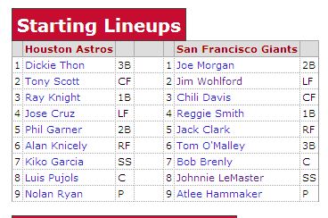 It’s June 8th, 1982 and Nolan Ryan is pitching for the Astros. Was Nolan Ryan a juicer? Go look at his stats. He was fiddling around in the 190-200 strike out range from ’83 tthrough ’86. Then all of a sudden he goes 270—228 and finally 301(!) in 1989 (at age 42), the same year that MANY A’s juiced themselves silly. That Astros LU looked a little less than imposing, didn’t it? Hayyymaker struck out 1 in nearly 7 full…..