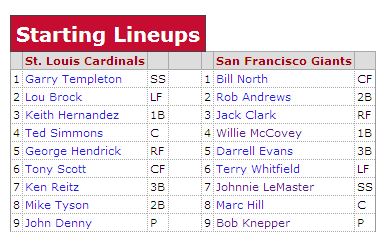 It’s Sunday, June 17th 1979 and the Cardinals are in town. Bad Ass names abound in their starting line up. Yet we still beat them 7-4. Clark ripped his 11th on the year and McCovey went 3-4 running his average to an impressive .291 (he would end the year at .249). This win nudged us to 4.5 games out of first place, the last time we would be this close the rest of the season. The wheels fall off pretty good in 1979…….