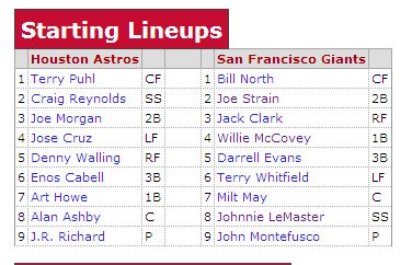 It’s April 13th, 1979 and the Astros are in town. Friday night, 16822 show up to see Halicki vs Joe Niekro. The Giants won 8-7 to run their record to an impressive 6-2. Unlike today’s Astro team, I recognize every single name in that starting LU. A couple weeks ago I said that everything from the ’70’s was either *badass* or *old school* and that Astro LU is both of those from the top to the bottom. Jack the Ripper banged a bomb and a triple and Mad Dog had 3 RBI’s to help with the win. A young, soon to be nicknamed *Hacman* Leonard entered midgame for the Astros, took over center field and went 1-2 with a run scored……..