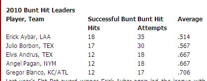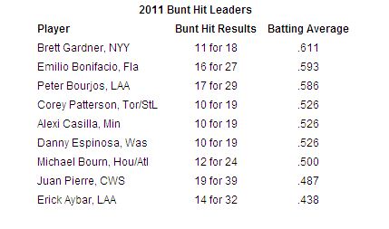 Last night, Michael posted an interesting stat about bunting for a base hit and the associated batting average. I think we were all surprised at how high those batting averages were.