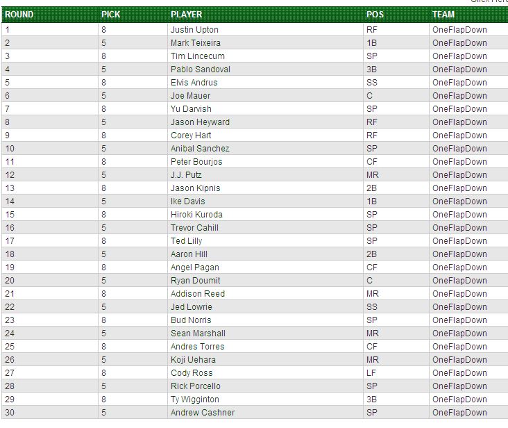 I had planned to take either Madson/Hanrahan or Bell in round 10 but all 3 went just before my spot so I went with Anibel and I’m fine with that, he is going to have a monster year. But that meant I had to pick up Putz in 12 and that is a huge risk to count on him as my #1 closer. (Bee Wheezy went in 11, by the way). That’s the reason I went with Reed, Marshall, Koji and Cashner in later rounds, I need at least 2 of those guys to assume the closer roles this year (I’m hoping the A’s trade for Koji thus giving him that value).