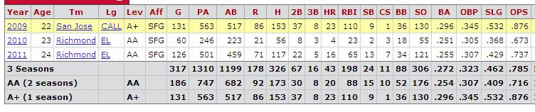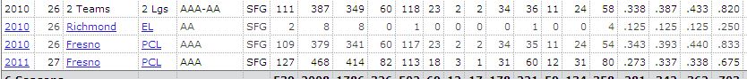 Peguero and Kieschnick are the two home grown guys. I put very little value on what players do BEFORE they get to AA. Any A-league is really made up mostly of pitchers who have one pitch, usually that’s a fastball, and the hitters down there just sit on it. AA and AAA is where you start to see the ball bend and that’s where you find out what kind of a hitter you’ve got.