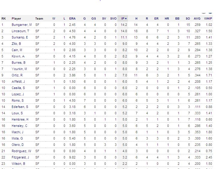Felled with a vomitous flu yesterday, I wasn’t able to get a main thread or a BBOTD up. But I’m back, mostly, walking upright with the rest of the humans. We’ve spent all Spring talking about the hitting, who plays where, how the rehab for Buster and Glass-chez are going, etc. Discussions related to the pitchers has been almost non-existent. And I’m not just talking about the blog, I listen to a fair amount of KNBR talk radio and neither the hosts or the callers seem to have to much interest in talking about the pitching. Part of that is because we don’t have too many jobs up for grabs. There might be one, if Bochy decides to go with 12 pitchers which he’s likely to do. Here are the pitching stats so far this spring. I reorganized it by *innings pitched* so we could see who is getting the most work and, therefore, who is getting the longest look…..