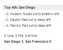 Looks pretty uninteresting, right? Just a nice, clean 1-2-3 inning for Timmy? Hardly. That inning was all-Cabrera. And if Pill were out there I would bet that he wouldn’t have gotten a glove on any of those 3 balls. Had Pill been playing LF, it is totally conceivable that the Padres would have put up 2 (or more) runs that inning. And that’s how lack of range defensively can turn a 2-1 victory into a 3-2 loss.