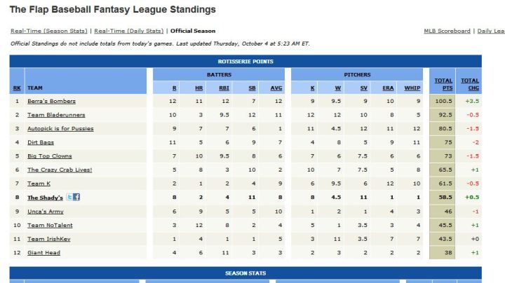 And I now present to the world, the Final Flap Fantasy League Standings. Edd, you dominated the rest of us with a 3.5 point *cherry on top of the soup* day yesterday (still not using that “soup” word right, am I?) . Congratulations to you and everyone who played hard till the end. Blade gave you a run for it but in the end, you were just too strong. DIRT gets an honorable mention for finishing 4th, almost as good as an improvement over last season as this year’s champion, Edd.