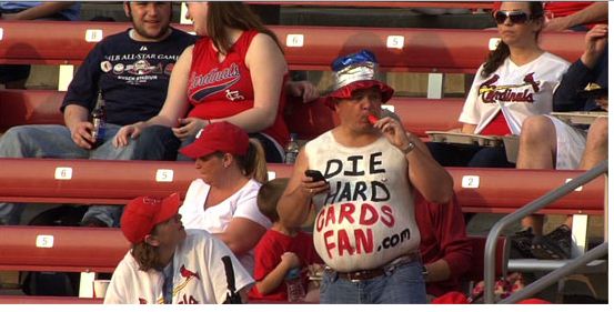 Onto the game itself: barely controlled insanity from the moment the team leaves the dugout. I warn my friend that we will be standing and sitting more often than at a Catholic wedding. It’s nearly impossible to see both the batter and the pitcher, what with all the rag-waving arms in the way, but I don’t care. Everything is going our way, and there is much high-fiving and hugging. Deb and I ask our neighbors to take a picture of us (see, I told you I had proof you were all with me last night). This sparks a conversation with the folks from Pleasanton, who make note of the website, and inform us that their boys, 4 and 6, misunderstood them when Hunter Pence arrived and he is forever to be known in their household as “Under Pants”. (Probably in my household, too.) Deb decides to go to the bathroom when Matheny pulls Lohse – rotten timing, but the bladder wants what it wants. We don’t even know about the crazy optical illusion that is Under Pants’ hit, but that makes the entire event no less magical for the crowd. And, it truly encapsulated the entire night – we all knew the baseball gods were on our side!
