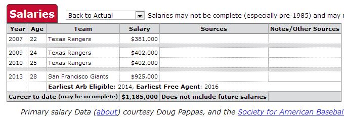 Romo had been fiddling around at the major league minimum until he made $1,575,000 in 2012. He hasn’t come to terms yet but he filed for $4.2 million, the Giants have countered at $2.8 (I think). He’ll make around $3.5 mil once they finally come to agree. Not a bad way to make a living……..