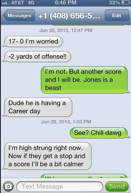 The one cool thing that football has over baseball: it’s always sudden death in the playoffs. I love sudden death. The baseball playoffs certainly don’t mirror the speed of the sport in the regular season, but as a fan you at least get to settle in for a journey. A process. If you have home field advantage and you lose game 1, everyone huddles around the water cooler at work debating just how devastating the loss actually was. It’s funny if you think about it. How often do the Giants lose the opening game of a home series and there’s barely a grumble from the fans. But goddammit, lose Game 1 of the playoffs and you’re at least shitting in your pants a little bit.
