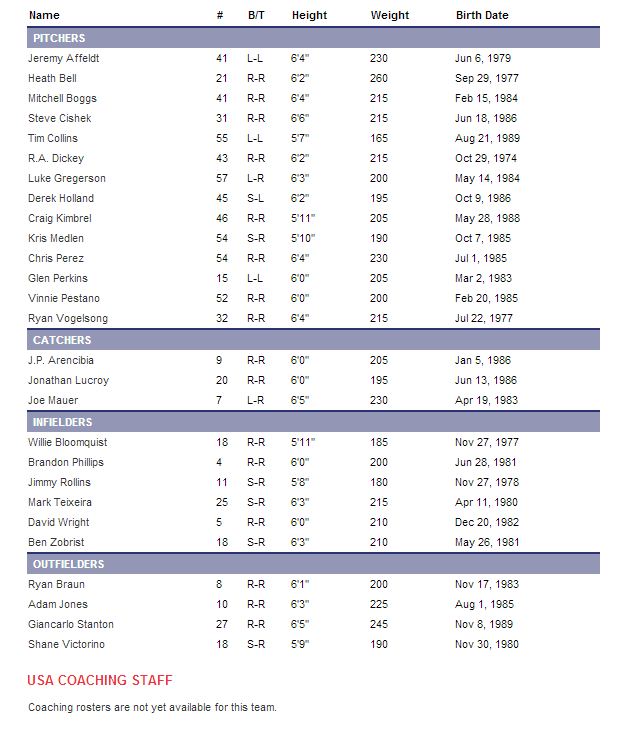 It’s a decent enough team. Despite the presence of Willie Bloomquist, I think we can take down Japan for once (they have won the first two *Classics*). Maybe Voggy gets to pitch in the finals at ATT? That would be cool.