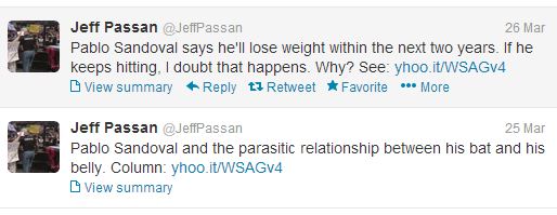 And yet as he sells his article via his tweet, he says with his own words that “he’ll lose the weight WITHIN the next 2 years…” The key word is *within* suggesting that Pablo said he will work on losing it from now until the 2014 season is completed. Pablo didn’t say *within*, Passan did.
