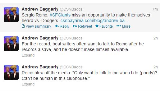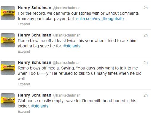 Look, Romo is not required to have to talk to reporters. It’s not like they ask anything but inane questions for him anyway. If he wants to bounce after a bad game, so be it. And if the beat guys are going to respond with pussy-fits like they did today then they shouldn’t worry about soft balling questions to these players. Just ask whatever you want to ask. And if you get kicked out of the clubhouse or shunned or blackballed then at least you earned it going out on the level.