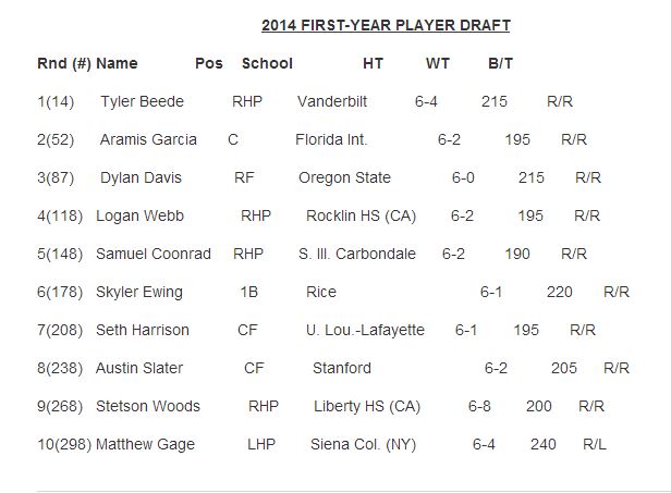 Only 5 pitchers drafted in the first 10 picks. This disappoints me. All 10 should be pitchers, at least in the first 10 rounds. Use the final 40 rounds (or whatever it is) to supply your minor league system with depth. It’s a little early, but I’m going to call out Dylan Davis as a total waste of a pick. Same with Seth Harrison and Austin Slater. If you’re an outfielder, and you get drafted by the Giants, you should be so bummed. All your hopes and dreams, dashed.
