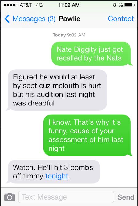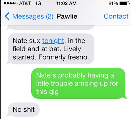 Here’s a clip of the text exchange I had with Pawlie Kokonuts last night and today. PK was at a minor league game last night and watched Nate S play.