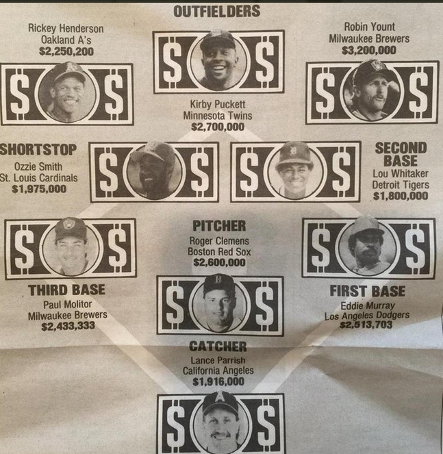 interesting news clipping someone found—25 years ago, top salaries at each position. I find it hilarious that the Brewers and A’s made up 33% of the list.