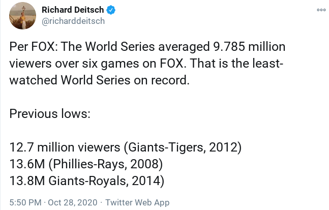 I don’t know a lot about ratings. Do they still have the Nielson ratings? I wonder if that’s an outdated way of gathering data. With the explosion of different ways people now watch sporting events I would question the accuracy of ratings we see now. Honestly, I can’t remember the last time I watched a sporting event on my tv. It’s been months. Everything is watched on a device now.