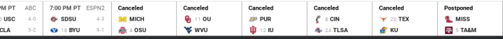 I went to draftkings today to do a few college football line ups all centered around Little Ricky from the University of Texas and to my dismay there have been a LOT of games cancelled today: