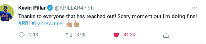 Kevin Pillar is ok. He is the ultimate gamer who got lucky, too. Easy 1.0 for him dealing with that near tragic event last night.
