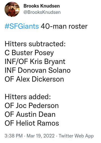 I move on from players very quickly. For me this won’t be hard to do at all. I’m not sold on Bart at all though so replacing Posey’s production will be a massive issue that will likely strongly impact their end of year win total.